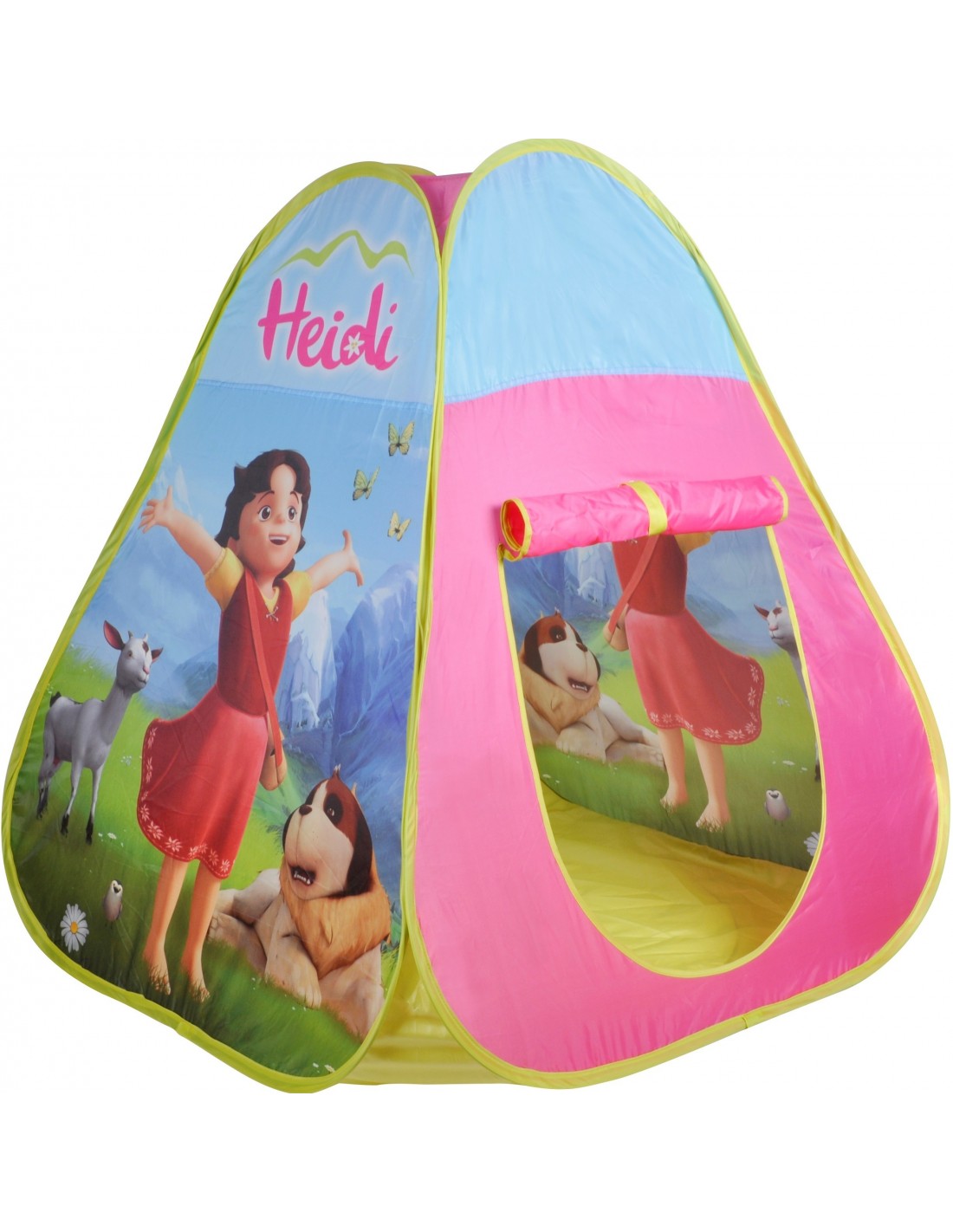 - Cortul de joaca cu 4 laturi este personalizat cu imagini viu colorate cu Heidi, fetita muntilor- Produsul este foarte usor de ansamblat, avand sistem de depliere de tip pop-up- Cortul de joaca este prevazut cu o usa de acces prin care copilul poate intra sau iesi din spatiul sau de joaca- Materialul din care este confectionat cortul este rezistent, protejand copiii de razele solare sau vant- Cortul este incapator, imprimat cu imagini din desenele Heidi, fetita muntilor, care il vor fascina pe copil- Cortul este construit pe o structura flexibila si poate fi montat usor, oricand copilul doreste sa se joace- Deschiderea si plierea rapida a cortului de joaca il fac un produs usor de depozitat- Cortul de joaca poate fi folosit atat in interior cat si in exterior, oferind un spatiu tematic perfect de escapada pentru copii- Dimensiune 75 x 75 x 90 (lungime x latime x inaltime)- Cortul de joaca este recomandat copiilor cu varsta mai mare de 2 ani