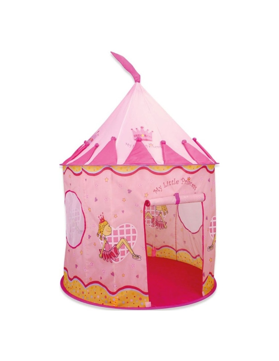 - Cortul de joaca My Princess aduce un plus de distractie pentru copii, fie ca alegeti sa il folositi pentru joaca de interior, fie ca il amplasati afara- In partea inferioara, cortul este prevazut cu material textil, astfel ca poate fi amplasat cu succes si in exterior, fara sa existe pericolul murdaririi copilului si a jucariilor- Joaca cu acest cort permite copiilor ore intregi de distractie si imaginatie, cu aventuri si jocuri de rol- Cortul de joaca este prevazut cu doua ferestre din material subtire transparent, prin care printesele pot privi din micul lor castel- Cortul de joaca are o usa mare de acces cu inchidere de tip velcro, prin care copilul poate intra sau iesi rapid- Materialul din care este confectionat cortul este impermeabil si foarte rezistent, protejand copiii de razele solare- Cortul este incapator, imprimat cu desene hazlii infatisand printese, care ii vor fascina pe copil- Cortul este construit pe o structura flexibila si poate fi montat usor oricand copilul doreste sa se joace- Deschiderea si plierea rapida a cortului de joaca il fac un produs usor de depozitat- Partea de jos a cortului precum si acoperisul sunt bine fixate datorita arcadelor flexibile- Cortul de joaca are o gentuta de transport din material textil cu fermoar- Produsul este destinat utilizarii in interior sau exterior si poate fi folosit simultan de mai multi copii- Cortul de joaca este recomandat copiilor cu varsta mai mare de 3 ani- Diametrul cortului este de 105 cm iar inaltimea acestuia este de 135 cm
