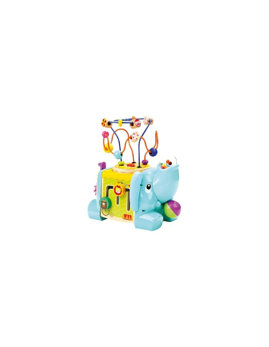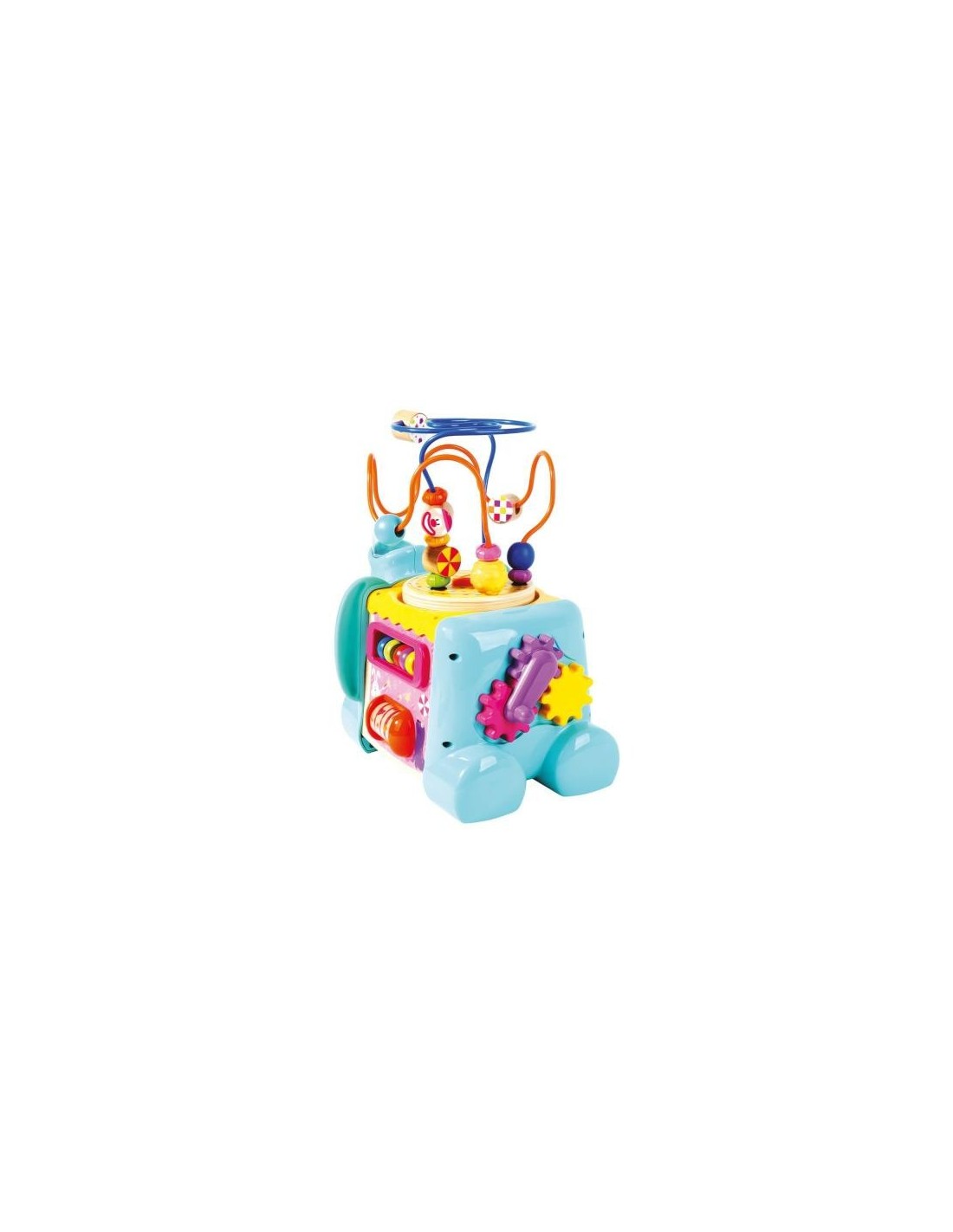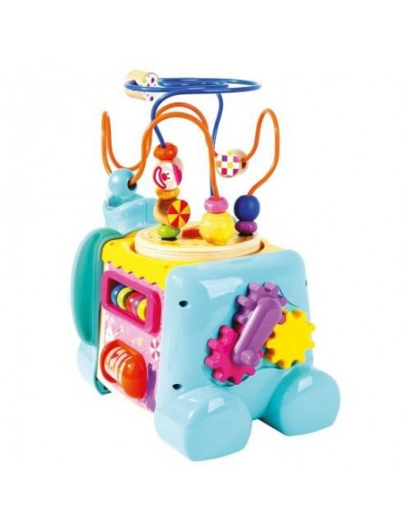 - Acest centru de activitati cubic are 5 parti: un labirint pentru exercitii motorii, o placa cu forme geometrice pentru sortare, puzzle cu doua fete si mecanisme colorate.