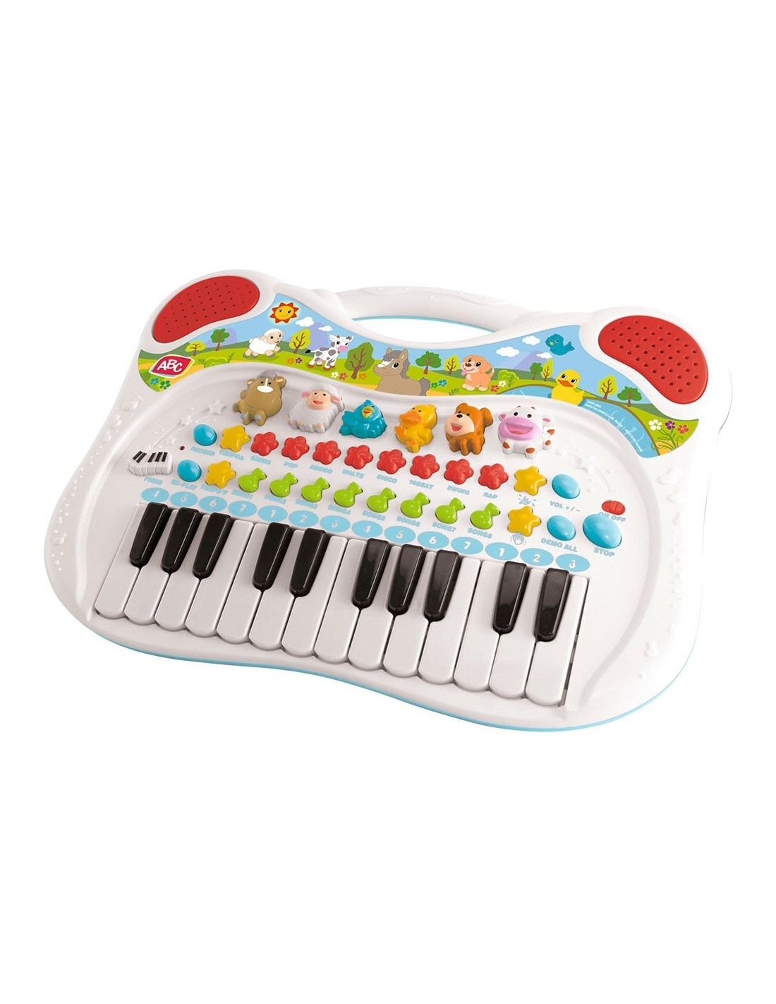 Orga cu animale ABC pentru micii muzicieni de la varsta de trei ani are butoane colorate si un autocolant mare cu motive dragute de animale