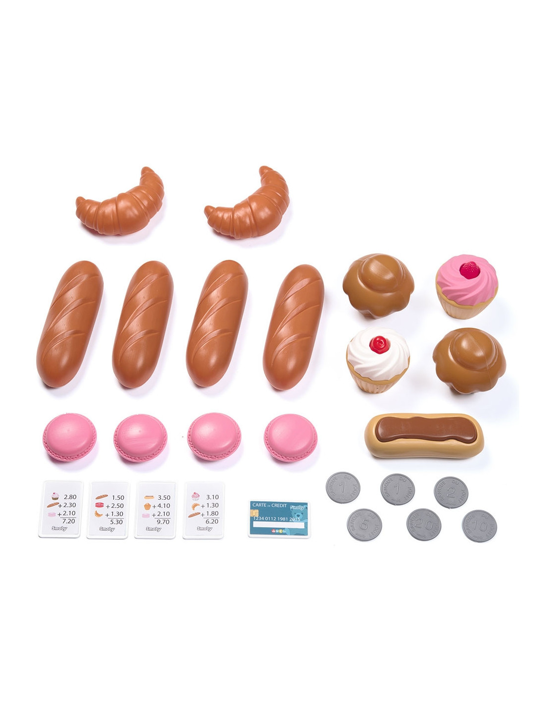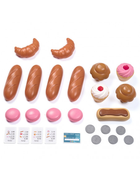 Pe rafturile magazinului regasim alimente cum ar fi: 2 croisante, 4 baghete, 4 cupcakes, 4 fursecuri si un tort