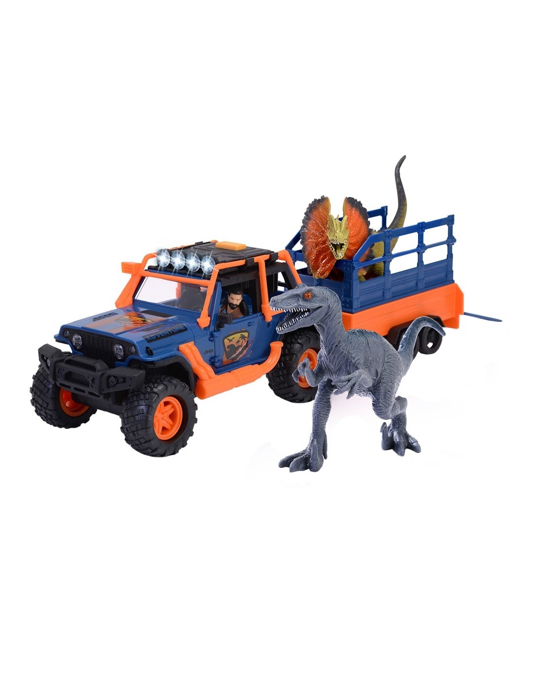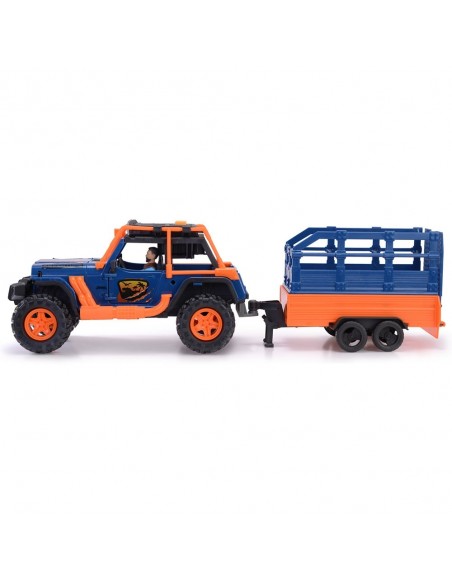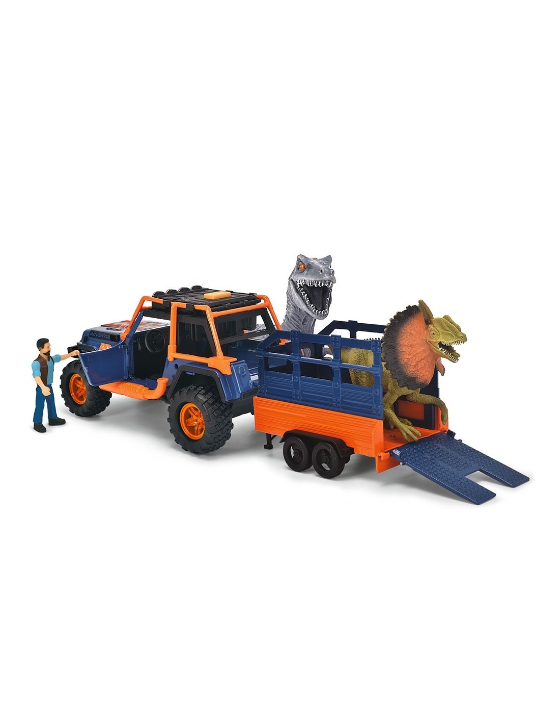 Masina are detalii frumoase si o remorca cu cusca pentru a transporta dinozaurii