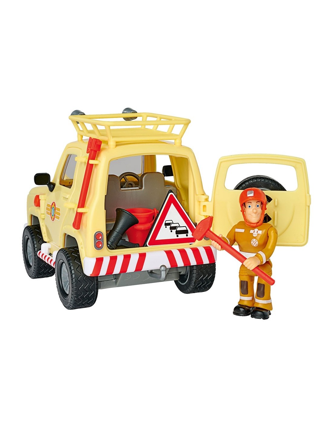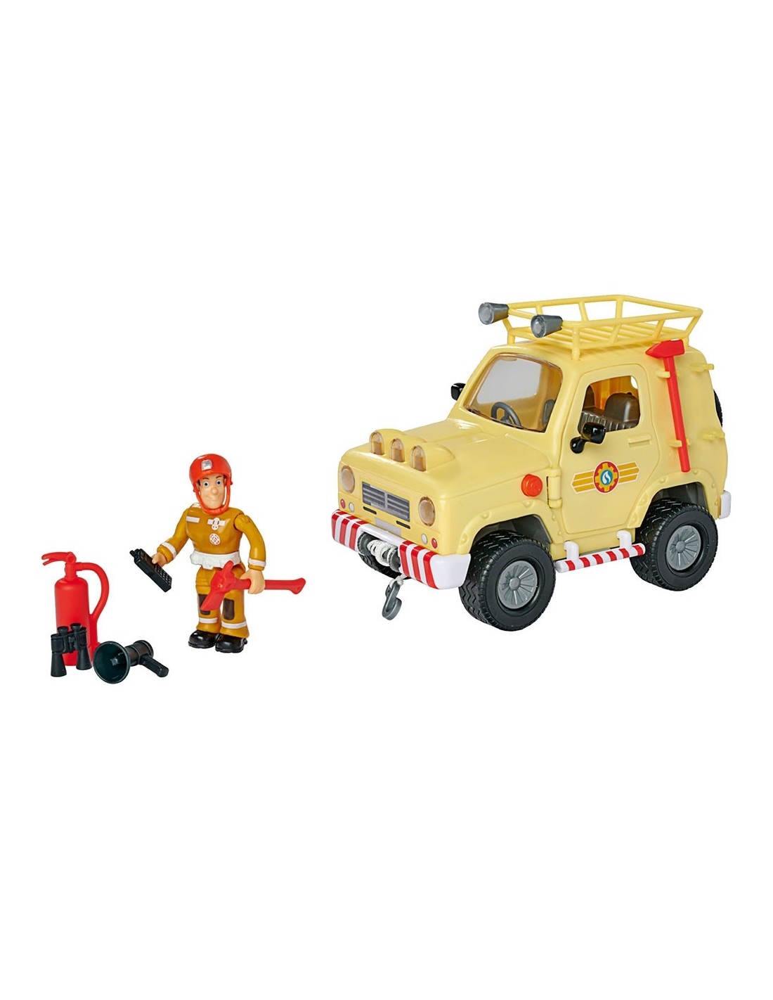Setul contine: jeep de salvare, figurina Sam, casca de pompieri, galeata, stingator, semn rutier, ciocan, topor, binoclu, walkie-talkie si megafon