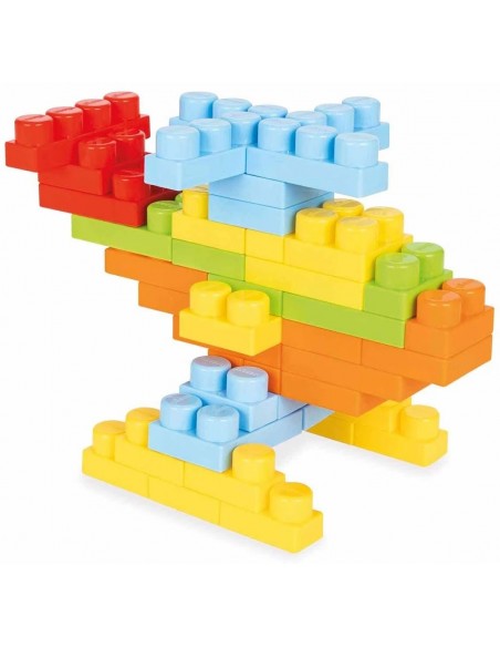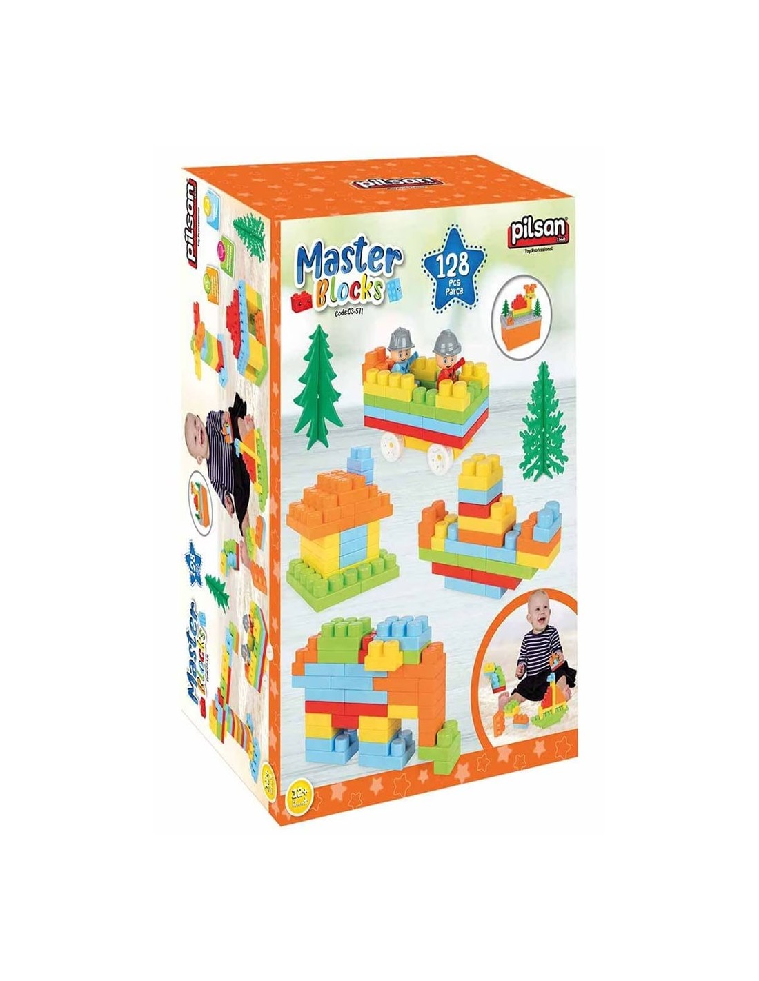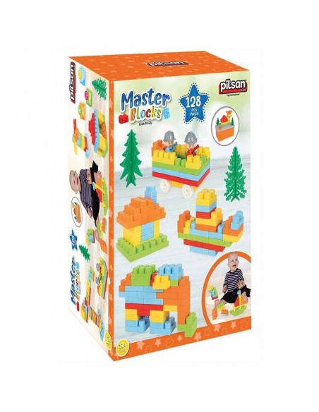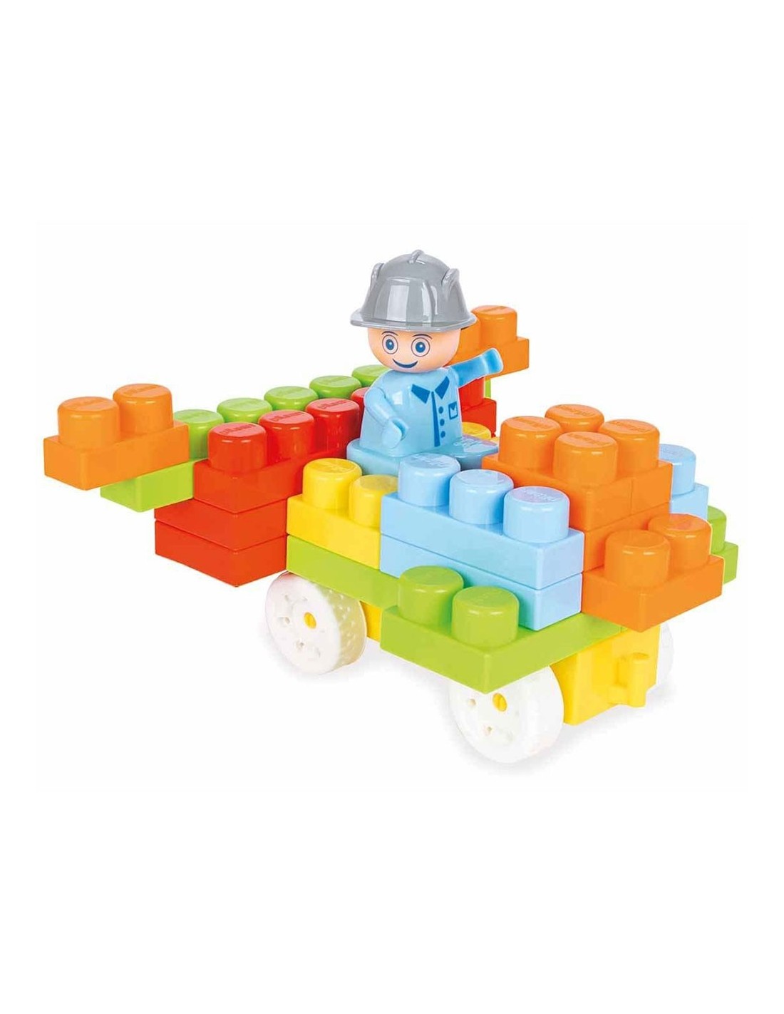 Setul contine 128 piese de construit, 2 copacei, 2 figurine, 2 masinute, 8 roti