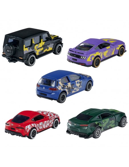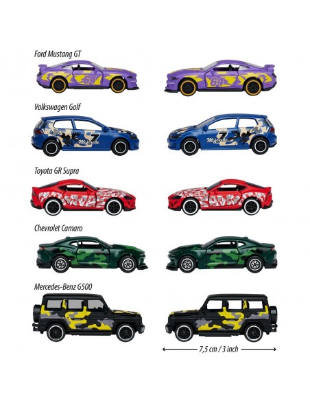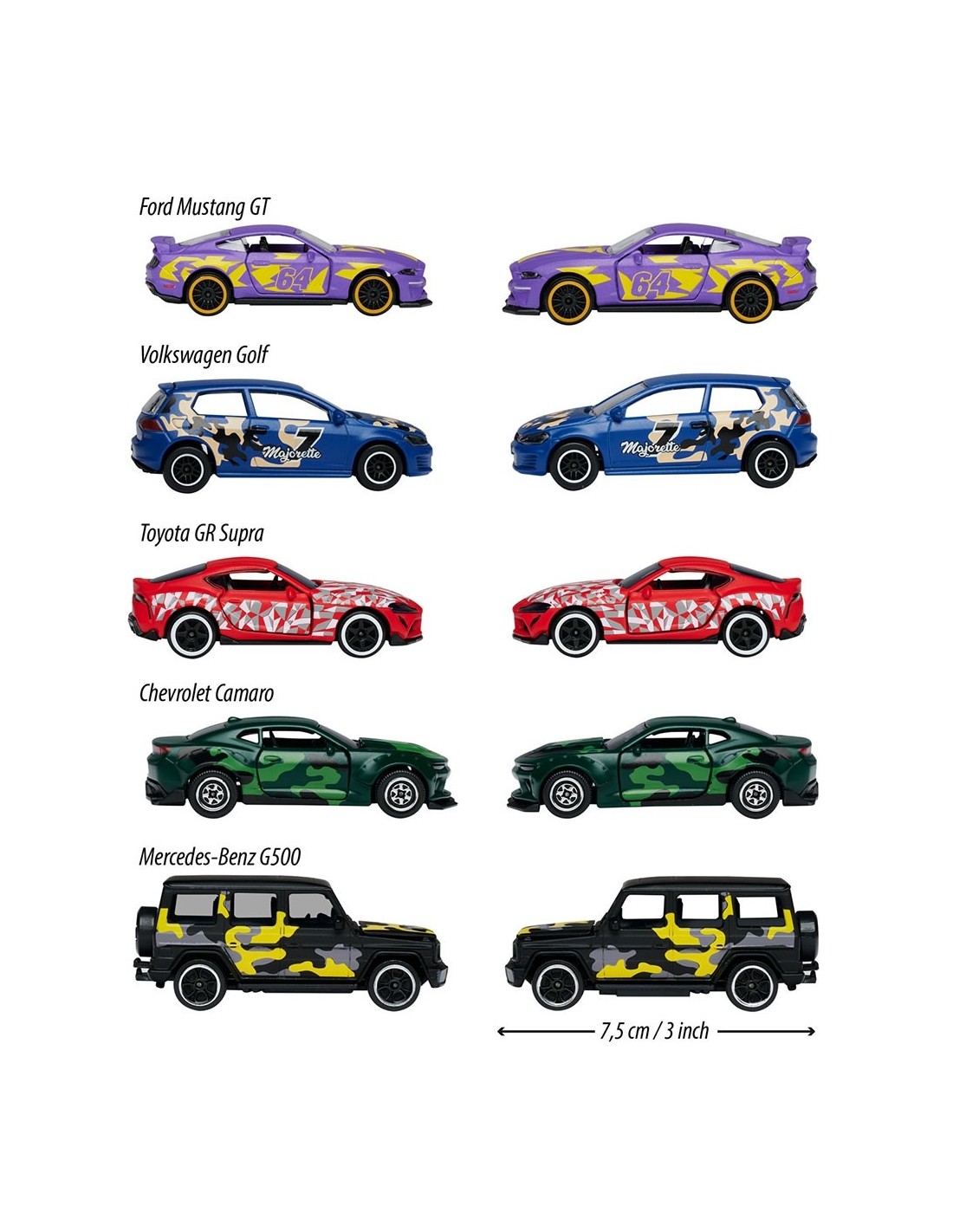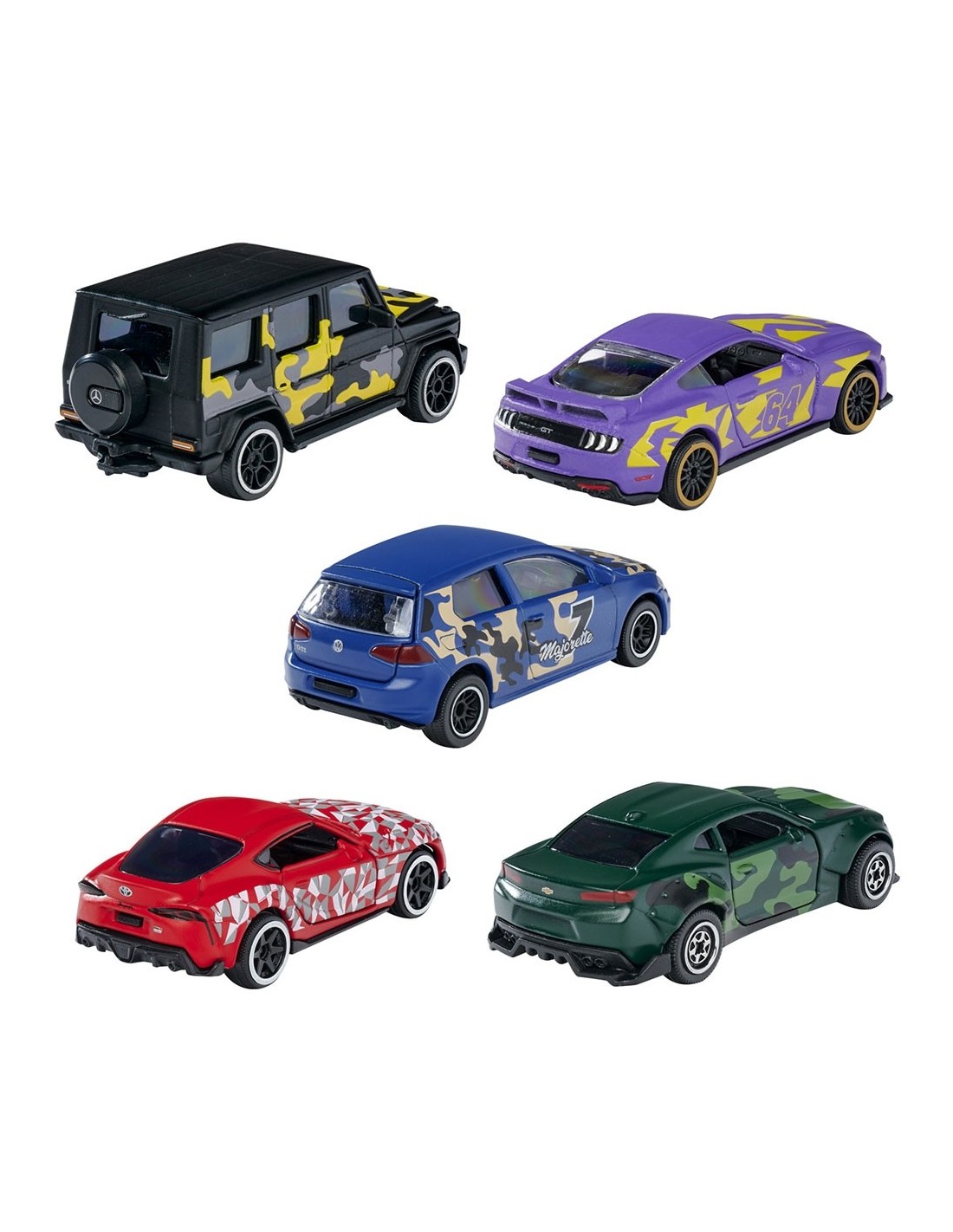 Setul contine: 1 masinuta Ford Mustang GT, 1 masinuta Volkswagen Golf, 1 masinuta Toyota GR Supra, 1 masinuta Chevrolet Camaro si 1 masinuta Mercedes-Benz G500