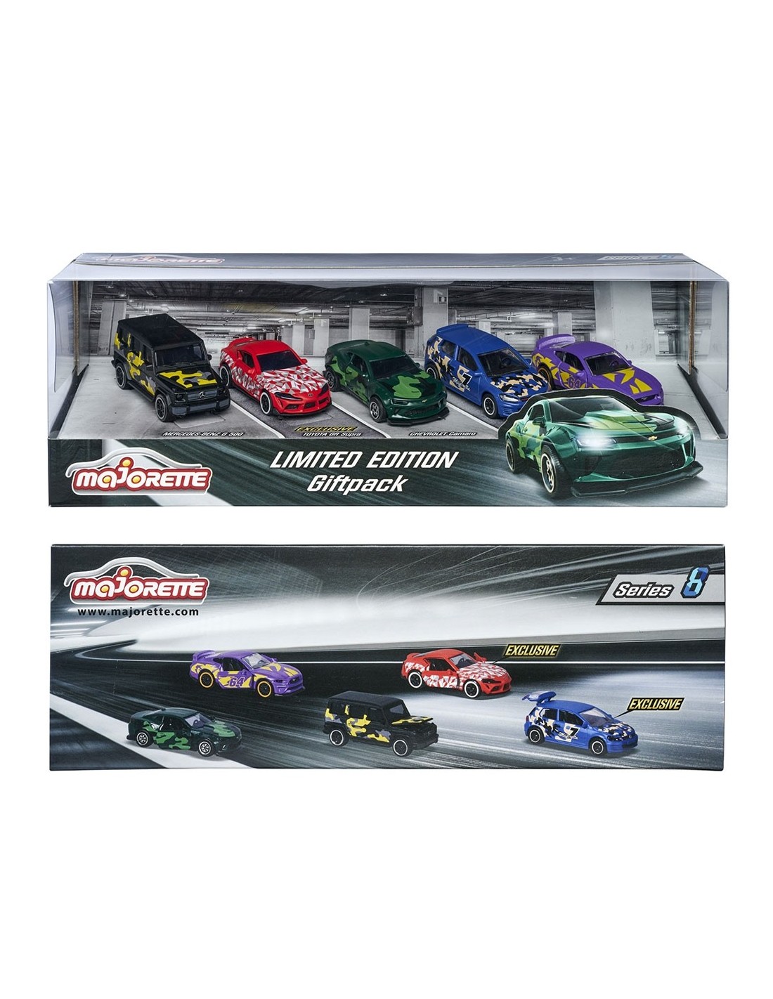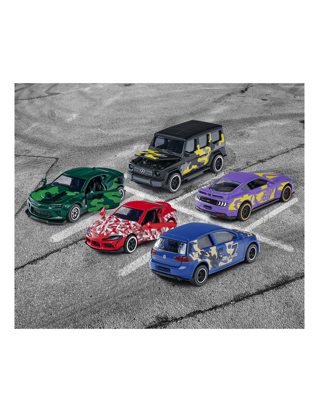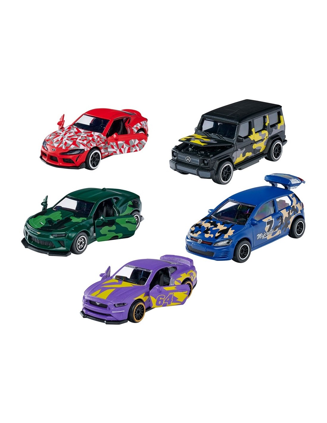 Setul contine: 1 masinuta Ford Mustang GT, 1 masinuta Volkswagen Golf, 1 masinuta Toyota GR Supra, 1 masinuta Chevrolet Camaro si 1 masinuta Mercedes-Benz G500