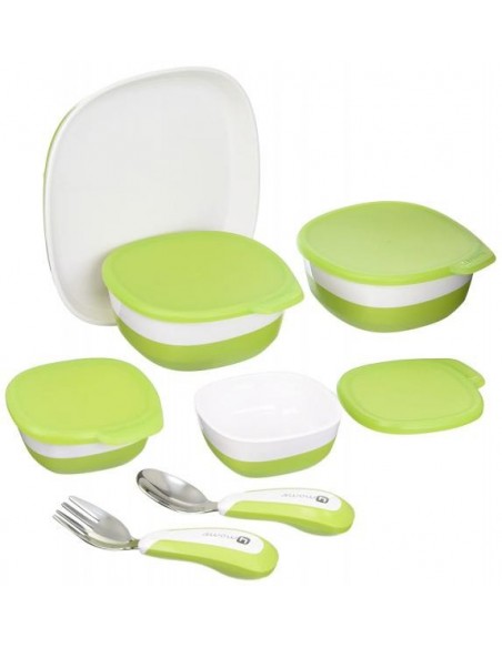 Setul include doua boluri si capace mari, doua boluri si capace mici, o farfurie si un set de tacamuri (furculita / lingura).