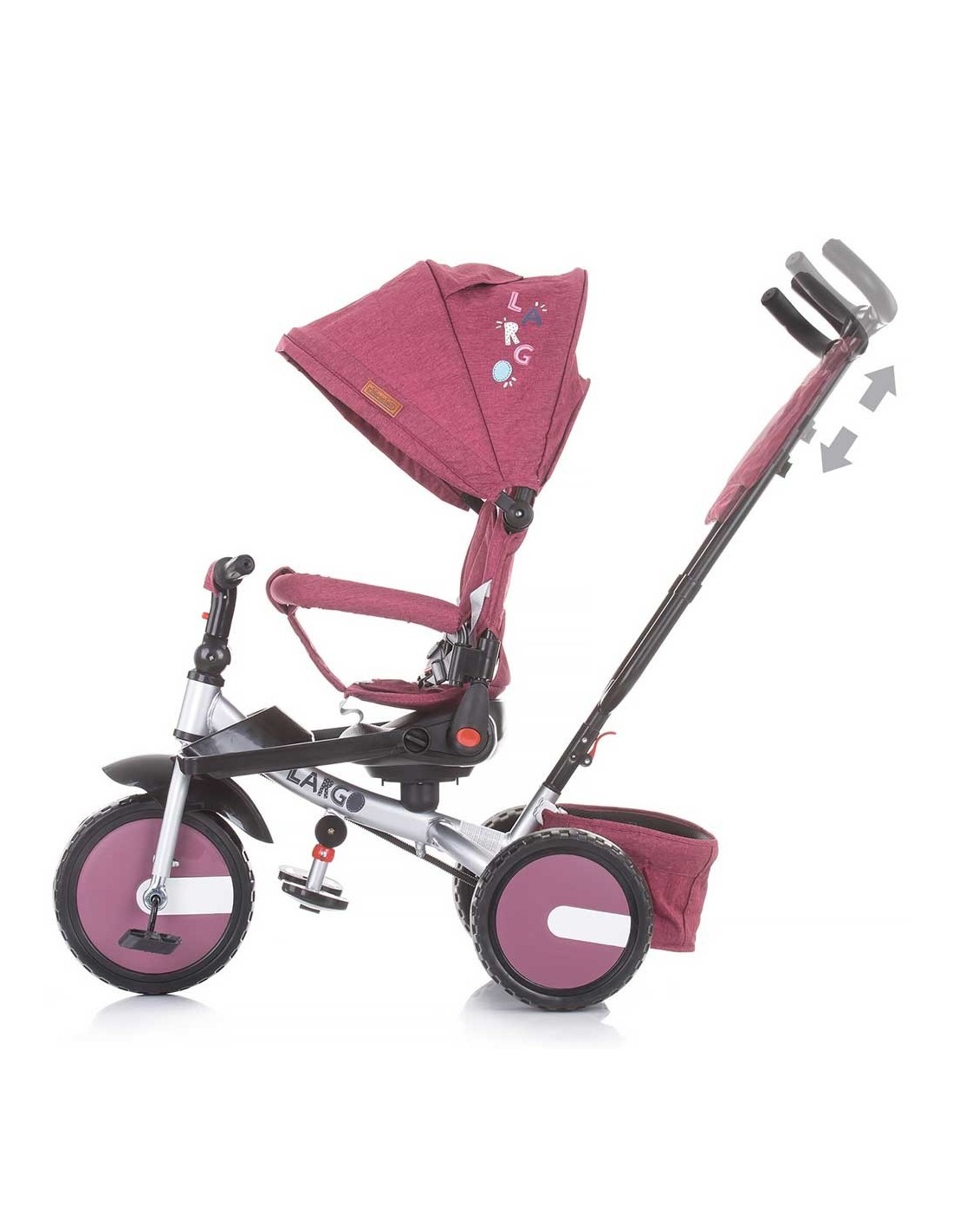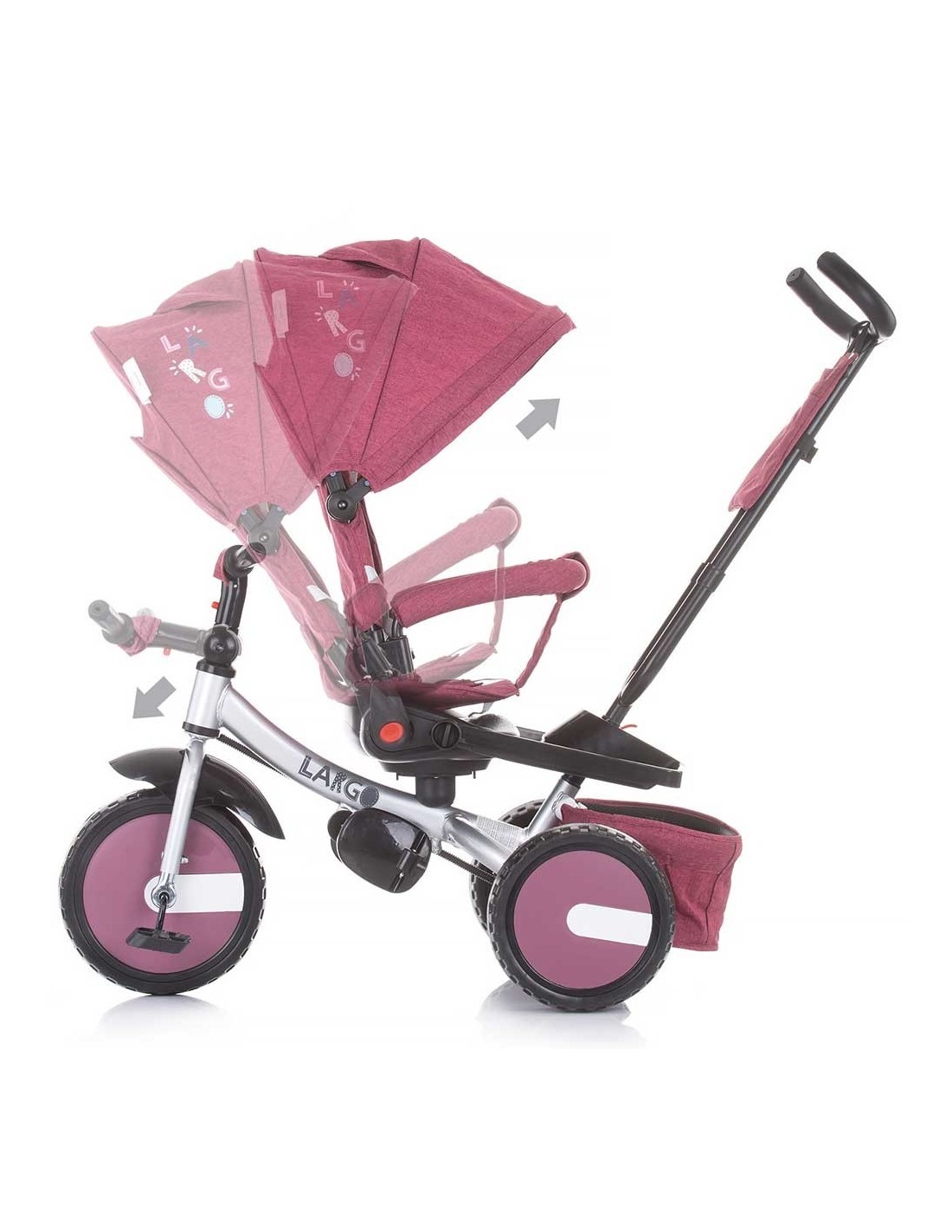 Produs multifinctional, poate fi pus in miscare de catre parinte prin actionarea manerului sau de catre copil prin actionarea pedalelor