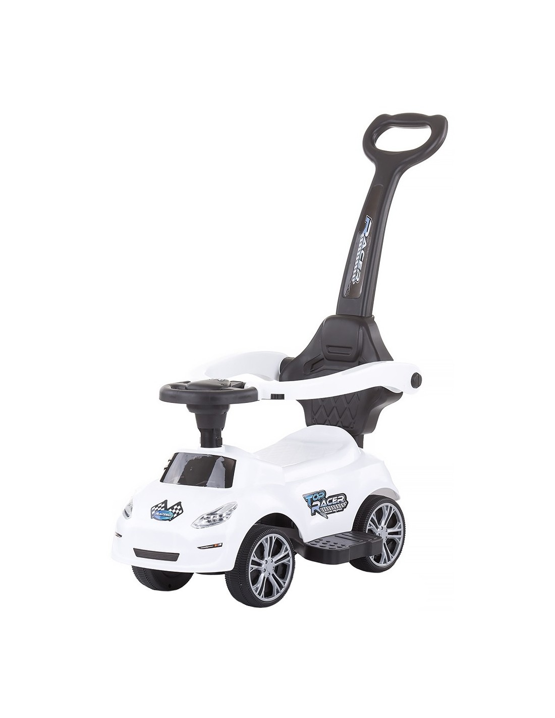 Masinuta se poate pune in miscare de catre copil cu ajutorul picioarelor sau de catre parinte cu ajutorul manerului